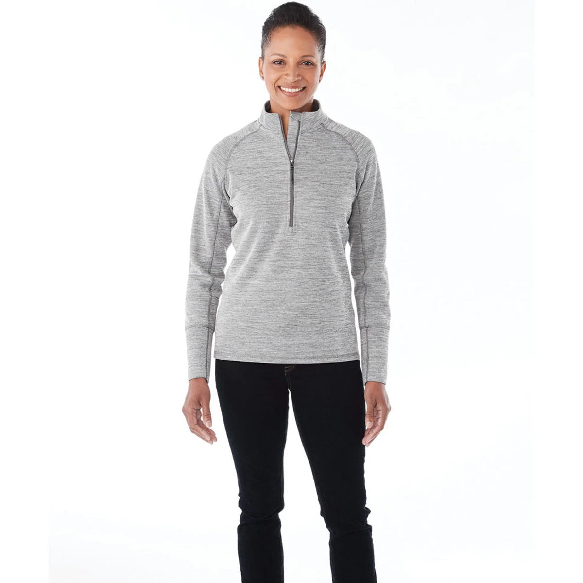 Elevate Women’s Heather Charcoal Crane Knit Half Zip is form fitting and fashionable in four fashion forward colors. The moisture wicking finish makes this the perfect half zip for a short run even in cold weather. Add a corporate or custom logo on to advertise while you exercise. Sleeve cuffs with thumb exits mean you can easily keep your hands toasty while taking a business call on the move. Offer as employee apparel to keep workers active or use personally as corporate apparel that is semi-formal, yet sleek in appearance. What are you waiting for? This decorated apparel is perfect to meet your needs.