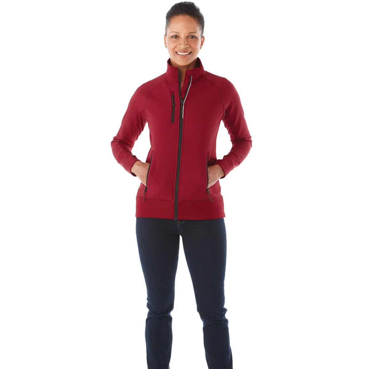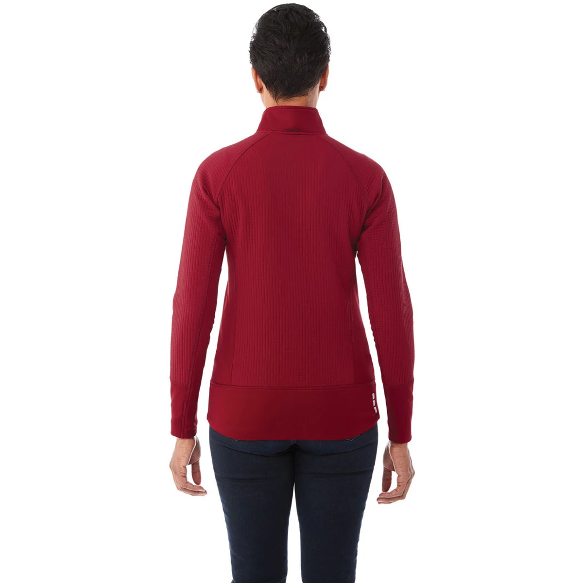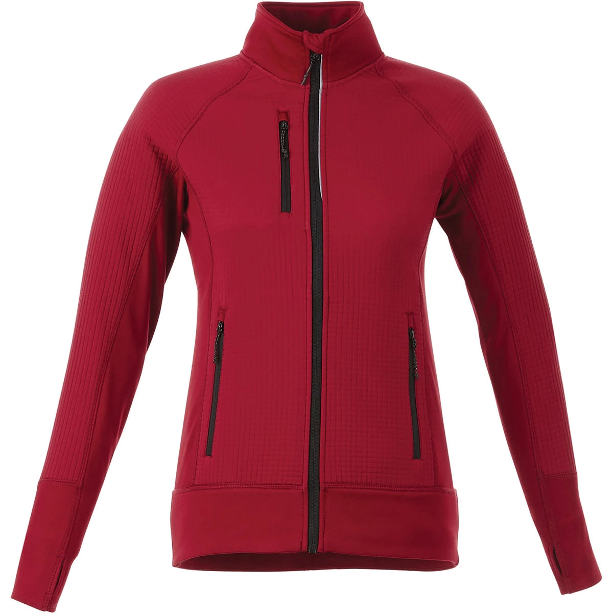 Enhance your wardrobe with the Elevate Women’s Vintage Red Panorama Hybrid Knit Jacket with full frontal zipper and a water repellant finish. We know you are busy, so choose employee apparel or corporate gifts that you can also enjoy. The running sleeve cuff with hand warmer and thumb exit mean you can use your phone and keep moving forward even in cold weather. The cover stitch detail mirrors the quality in the entire piece. Available in four bold colors, custom order several with your corporate embroidery to help unite your company team or encourage cooperation. Those lucky enough to wear one of your custom created knit jackets will know the quality product you provide!